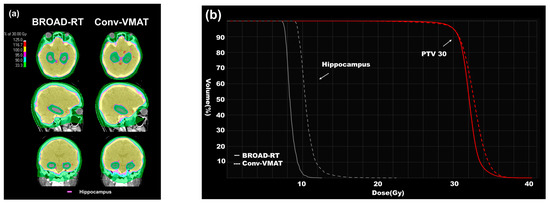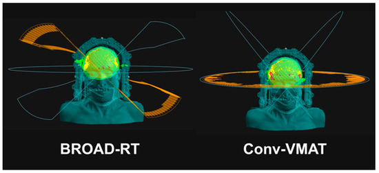 Examples of BROAD-RT and Conv-VMAT dose distributions are shown in Figure 3a,b.