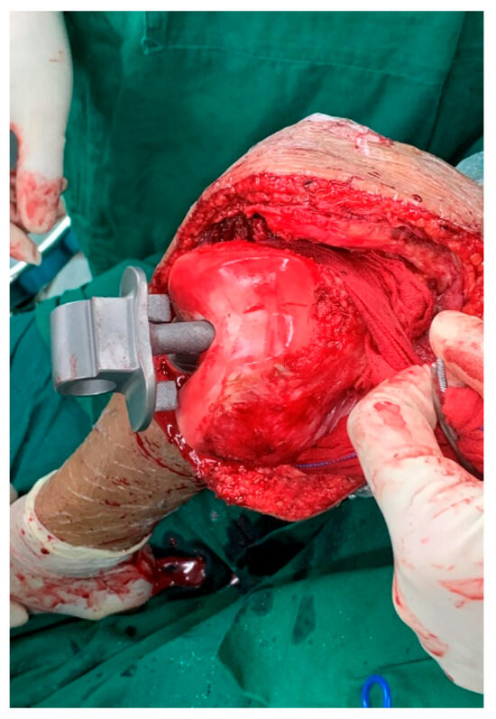 During the preparation of the distal femur, we advertently left behind the condylar cartilage of the distal femoral condyle. We proceeded to open the femoral canal using a 6 mm awl, followed by minimal reaming and the fixation of the femur component. The prosthesis stalk has a smooth surface and does not remove bone during reaming. After determining the internal and external rotation angles, the femoral stalk penetrates the femoral condyle and is directly inserted into the medullary cavity without bone cement (Figure 2).