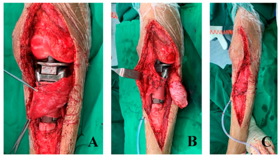 The photos show that gastrocnemius rotation flap reconstruction was performed (A); the extensor mechanism was reconstructed using an artificial ligament (B); and the gastrocnemius rotation flap was wrapped around the endoprosthesis (C). (Patient No. 1).