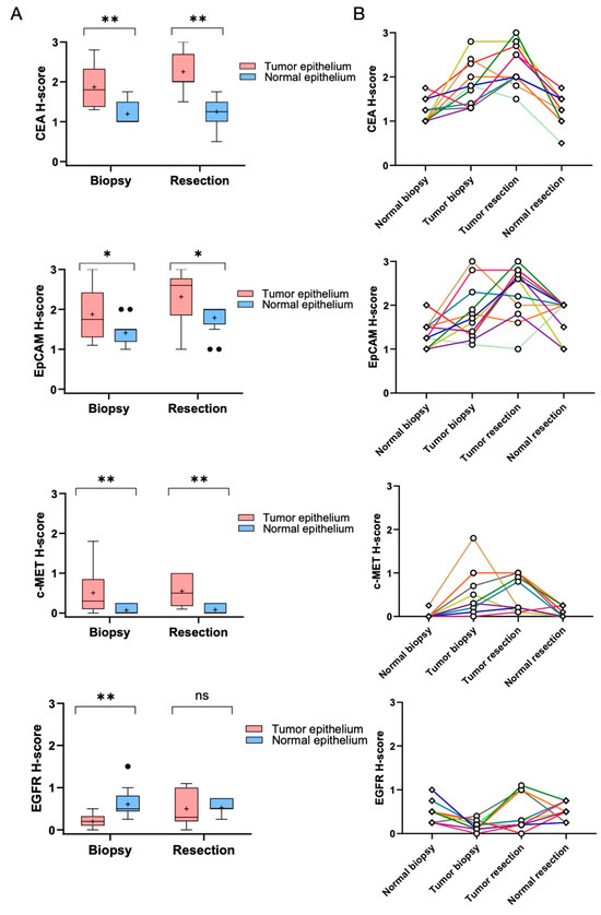 Expression changes of CEA, EpCAM, c-MET, and EGFR in paired tumor and normal tissues before and after CRT. The expression level of CEA, EpCAM, c-MET, and EGFR by comparing H-scores in paired tumor and adjacent normal epithelial tissues at two time points: diagnostic biopsies (pre-CRT) and resected specimens (post-CRT). (A) Box plots display the distribution of H-scores for each marker in tumor tissues compared to adjacent normal epithelial tissues. The box plots include the first quartile (Q1), median, third quartile (Q3), and maximum values. Outliers are marked with black dots (●), while the plus sign (+) represents the mean. Error bars indicate the data range, and statistically significant differences are denoted by asterisks (*). Significant differences between tumor and normal tissues were determined using the Wilcoxon signed-rank test. (B) Line graph shows individual changes in marker expression across patients. Each colored line represents changes in H-scores for an individual patient, showing the trajectory of expression for tumor and adjacent normal tissues before (indicated by ‘Normal biopsy’ and ‘Tumor biopsy’) and after CRT (indicated by ‘Normal resection’ and ‘Tumor resection’). A horizontal line represents equal expression levels between tumor and normal tissues, while ascending or descending lines indicate higher or lower expression in tumor tissues, respectively. Patients included in this analysis had H-scores available for both tumor and normal tissues at both time points. Abbreviations: chemoradiotherapy, CRT; ns, not significant; * p < 0.05; ** 0.001 ≤ p < 0.01.