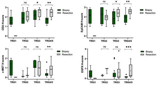 Histological score (H-score) comparison for tumor markers between pre-treatment biopsy and post-treatment specimens in various response groups to treatment. Box plots illustrate first quartile (lower part), median, third quartile (upper part), and maximum values. The outliers are shown by the black dots (●). The plus sign (+) represents the mean and error bars represent the data range. Comparison between biopsy and resection was performed using Wilcoxon signed-rank test. Statistically significant differences in expression levels are denoted by asterisks (*). For TRG1 patients, no residual tumor was present in the resection specimens. Abbreviations: TRG, tumor regression grade; TRG1, grade 1 (complete response); TRG2, grade 2 (near complete response); TRG3, grade 3 (moderate response); TRG4/5, grade4/5 (minimal to no response); ns, not significant; * p < 0.05; ** 0.001 ≤ p < 0.01; *** p < 0.001.