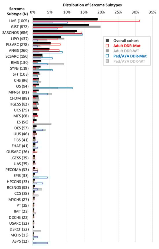 Distribution of sarcoma subtypes. Subtypes sorted by the proportion of the overall study cohort. Samples further stratified into DDR-mutant (Mut) and wildtype (WT) subgroups for adult and ped/AYA patients.