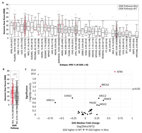 Association between DDR pathway alteration and HRD phenotype. (A) Genomic scar score (GSS) distribution by sarcoma subtype, with DDR pathway-mutated samples indicated in red. (B) Samples stratified by DDR pathway alteration status. Dashed line in A and B indicates threshold for presumed homologous recombination deficiency (HRD; GSS ≥ 42). (C) Volcano plot of GSS median fold changes for samples stratified by individual DDR gene alteration status. *** p < 0.001.