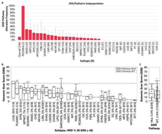 Although ped/AYA samples profiled by WES were limited, median GSS ranged from 3 to 41 across sarcoma subtypes, with the lowest and highest medians observed in solitary fibrous tumor and undifferentiated uterine sarcoma, respectively (Figure 4B). A low HRD frequency was observed among ped/AYA sarcomas overall (2.6% vs. 7.9% in adult sarcomas, p = 0.002), with HRD samples limited to undifferentiated uterine sarcoma (33.3%, 1/3), pleomorphic sarcoma (25%, 1/4), spindle cell sarcoma (11.1%, 1/9), MPNST (6.7%, 1/15), and sarcoma NOS (6.1%, 3/49). However, ped/AYA DDR pathway-altered sarcomas were not associated with significantly higher GSS (median GSS 19 vs. 16 in WT, p = 0.36), and none were considered HRD, while HRD was observed in 2.9% (7/239) of DDR pathway-WT samples (Figure 4C).