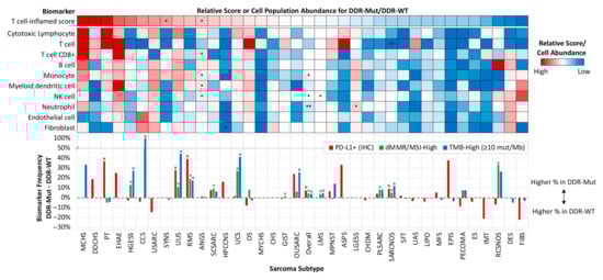 The gene expression profiles of patient samples that underwent whole transcriptome sequencing were further analyzed for immunotherapy-related biomarker associations with DDR pathway alteration, including analysis of a gene expression signature that predicts for response to pembrolizumab (T cell-inflamed score) and quantification of the relative abundance of immune and stromal cell populations (MCP-counter) [21,22]. T cell-inflamed scores were significantly increased in DDR pathway-altered synovial sarcoma (+0.15 arbitrary units, AU) and angiosarcoma (+0.10 AU), with numerically increased median scores observed for several other subtypes, which correlated with increased abundance of pro-inflammatory cell populations in subtypes with higher T cell-inflamed scores (Figure 5). DDR pathway alterations were associated with increased frequency of PD-L1+ IHC overall (+7.3%) and among rhabdomyosarcoma (+39.1%), phyllodes tumor of breast (+37%), undifferentiated uterine sarcoma (+27.9%), and sarcoma NOS (+9.3%) subtypes (all p < 0.05). The frequency of dMMR/MSI-High and TMB-High was also increased in DDR pathway-altered sarcoma compared to DDR pathway-WT overall (+4.4% and +3.7%, respectively), as well as in high-grade endometrial stromal sarcoma; +13.0% and +27.2%), undifferentiated uterine sarcoma (+11.1% and +44.4%), rhabdomyosarcoma (+19.1% and +17.3%), uterine carcinosarcoma/uterine malignant mixed mullerian tumor; +26.9% and +41.2%), leiomyosarcoma (+3.8% and +4.6%), and sarcoma NOS(+4.9% and +11.9%) subtypes (all p < 0.05). Additional subtypes with an increased frequency of dMMR/MSI-High among DDR pathway-altered tumors included round cell sarcoma, NOS (+33.3%), spindle cell sarcoma (+9.5%), osteosarcoma (+8.3%), pleomorphic sarcoma (+8.3%), and gastrointestinal stromal tumor (+1.5%), while TMB-high frequencies were increased in DDR pathway-altered tumors among clear cell sarcoma (+95.8%) and other uterine sarcoma (+25.8% TMB-High) subtypes (all p < 0.05).