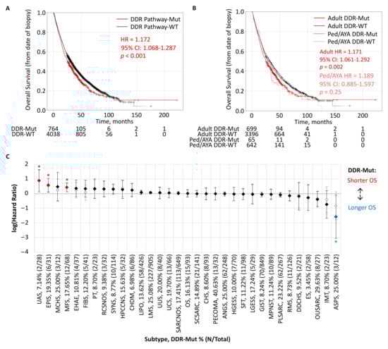 To determine the potential clinical impact of DDR pathway alterations, real-world patient overall survival was determined from insurance claim-based data. Among 4802 patients with data available, patients harboring DDR pathway mutations (15.9%, N = 764) had significantly shorter overall survival compared to WT patients (HR = 1.172, 95% CI: 1.068–1.287, p < 0.001, Figure 6A). Further stratification by age groups showed DDR-mut was associated with shorter overall survival among both adult and ped/AYA patients, although not statistically significant among ped/AYA patients, in part due to the limited sample size of that subpopulation (Figure 6B). When stratifying by sarcoma subtype, DDR pathway mutations were associated with significantly shorter overall survival among uterine adenosarcoma, epithelioid sarcoma, and myxofibrosarcoma, while DDR mutations were associated with longer overall survival among patients with alveolar soft part sarcoma when adjusted for age and sex in a multivariate analysis (Figure 6C).