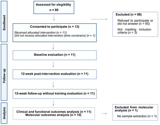This single-arm quasi-experimental pilot study was conducted at the Miguel de Cervantes European University (Valladolid, Spain) between March 2024 and October 2024. The intervention comprised a 12-week supervised concurrent training program and a 12-week follow-up period without training. Molecular, functional, and clinical outcomes, including self-reported questionnaires, were assessed one week before (baseline) and after (post-intervention) the 12-week training program and one week after the 12-week follow-up period without training (follow-up). The study compiled with the standards of good clinical practice and the Declaration of Helsinki and was approved by the Ethics Committee for Drug Research of the Valladolid East Health Area on 23 November 2023 (PI 23-3382). All participants signed a written informed consent before the start of the study.
