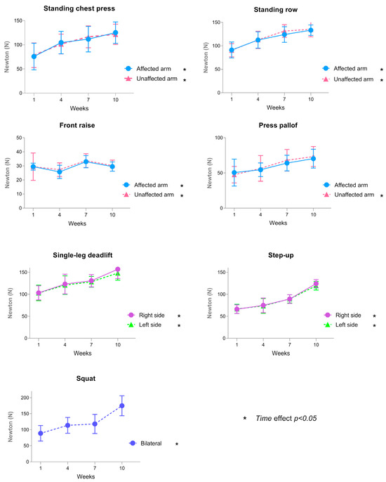 Adherence to training sessions was 92.05%, with an average of 22 ± 3 of 24 possible sessions completed. No adverse events or BCRL onset or exacerbations were recorded during the study period. All sessions were accomplished with a moderate EC according to RPE (Borg CR-10 scale 6.26 ± 0.28 points) [26,48]. The average percentage of the theoretical maximum HR was 72.18 ± 1.01% during the aerobic part, which corresponded to a moderate intensity. During the intervention, the progression in resistance training intensity was systematically monitored and adjusted. As previously mentioned, a force sensor was used to objectively monitor changes in the training load every three weeks. The load was progressively increased by modifying the resistance band and/or adjusting the number of repetitions. Figure 2 represents the load progression through force sensor assessments (N) over the 12-week intervention. A significant time effect (p < 0.05) on the training intensity was shown for all exercises over the training weeks, except for the Pallof press on the affected arm.