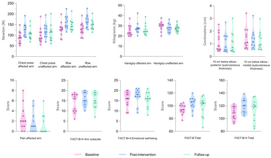 A significant time effect was observed for pain, measured through an NRS (p = 0.038). Specifically, pain decreased at post-intervention compared with the baseline (p = 0.005). In addition, a significant time effect was observed in the results of the FACT-B+4 questionnaire for arm subscale (p = 0.016), emotional well-being (p = 0.039), total FACT-B (p = 0.011), and FACT-B+4 (p = 0.003) scores. Except for arm subscale, the other results improved in post hoc analysis at post-intervention compared with the baseline (p = 0.027 for emotional well-being; p = 0.005 for total FACT-B; and p = 0.001 for total FACT-B+4 score). The results for the DASH questionnaire did not reveal a significant time effect (Supplementary File S4, Supplementary Material). ES estimations for all analyzed outcomes are reported in Supplementary Files S4–S6, Supplementary Material.
