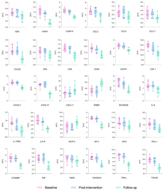 Specifically, in post-hoc analyses, the following 19 proteins exhibited a significant decrease in the follow-up assessment compared with the baseline and post-intervention (p < 0.001): Axin-1 (AXIN1), caspase-8 (CASP-8), C-C motif chemokine 3 (CCL3), C-C motif chemokine 4 (CCL4), C-C motif chemokine 28 (CCL28), T-cell surface glycoprotein CD6 isoform (CD6), CD40L receptor (CD40), CUB domain-containing protein 1 (CDCP1), fractalkine (C3XCL1), protein S100-A12 (EN-RAGE), leukemia inhibitory factor receptor (LIF-R), neurotrophin-3 (NT-3), osteoprotegerin (OPG), programmed cell death 1 (PD-L1), STAM-binding protein (STAMBP), TNF, TNF receptor superfamily member 9 (TNFRSF9), TNF-related apoptosis-inducing ligand (TRAIL), and TNF (Ligand) superfamily member 12 (TWEAK). In addition, TNF-beta (TNFB), macrophage colony-stimulating factor-1 (CSF-1), and eotaxin (CCL11) levels were lower at follow-up compared with the baseline, and IL-8 and C-C motif chemokine 25 (CCL25) were reduced at follow-up compared with post-intervention (p < 0.001). In contrast, monocyte chemotactic protein 2 (MCP-2) and delta and notch-like epidermal growth factor-related receptor (DNER) showed a significant increase at follow-up compared with the baseline and post-intervention assessments (p < 0.001).