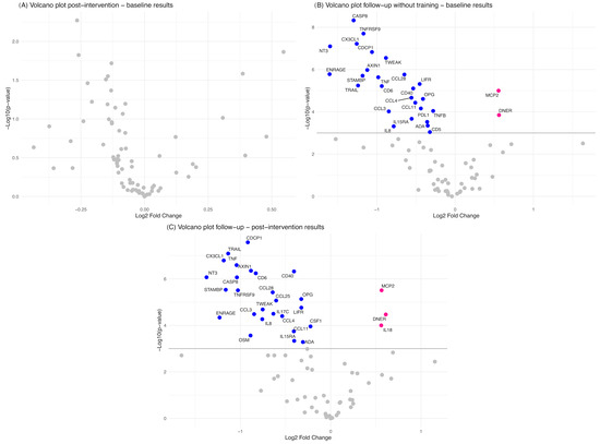 Volcano plots generated to compare protein levels (NPX) between (A) post-intervention versus baseline results, (B) follow-up versus baseline results, and (C) follow-up versus post-intervention results. The y-axis shows the log10 value of the p-values, and the x-axis shows the log2 fold change between the time points, with a negative fold change indicating a lower protein expression level in the post-intervention or follow-up assessments. The names of the proteins that showed a significant change (p < 0.001) are shown.