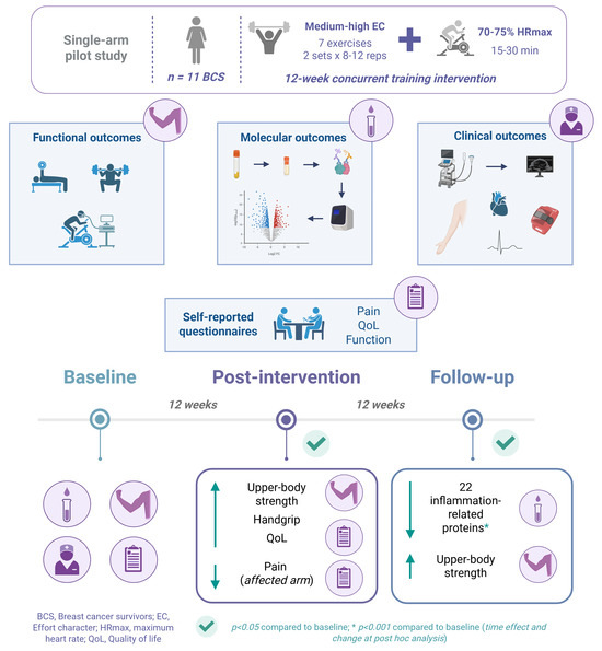 Therefore, this single-arm study primarily aimed to investigate the impacts of concurrent training on upper- and lower-body strength and inflammation-related proteins in BCS with BCRL or at risk of developing it. In addition, the effects of the intervention on functional (handgrip strength and CRF) and clinical outcomes (body mass index [BMI], arm volume, subcutaneous and muscle thickness, ROM, physical activity levels, and heart rate variability [HRV]) were assessed along with self-reported measures of pain, function, and QoL after a 12-week concurrent training program and after a 12-week follow-up period without training.