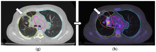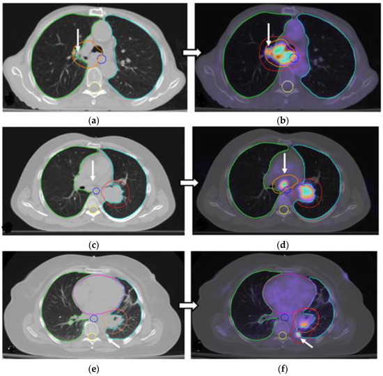 Target volumes in radiotherapy are typically delineated using computed tomography (CT) images. Lung lesions often overlap with atelectasis, making it challenging to distinguish the tumor margins, while small tumor deposits in the primary tumor margins or lymph nodes may easily escape the physician’s attention [9]. This may lead either to adopting larger target volumes that allow unwanted spread of radiation to healthy tissues or, in contrast, to omitting involved areas in the RT plan [10,11].