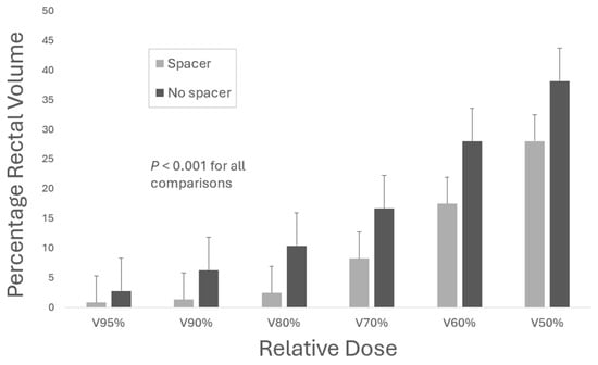 A dosimetric comparison of the radiation exposure to the rectum, presented as the percentage of the prescribed dose overlapping with a percentage of the rectal contour (V-percent dose), between spacer and non-spacer patients.