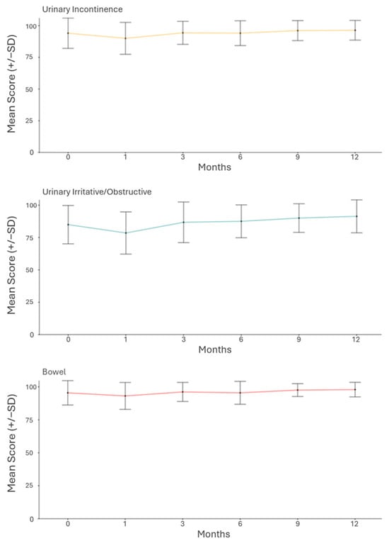 Changes in patient-reported quality of life based on EPIC-26 domains: urinary incontinence, urinary irritative/obstructive, and bowel.