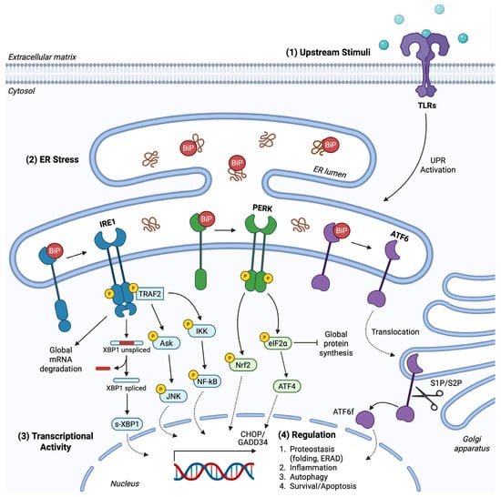 The UPR pathway. (1) Upstream stimuli provoked by transactivation or by ligand–receptor interactions, among others lipopolysaccharide/TLR interaction, provoke UPR signaling. An inflammatory microenvironment, enriched with chemokines and other extracellular inflammatory mediators, excites receptors’ activity towards UPR induction. (2) ER stress, independent of receptor-dependent cascades, promotes the dissociation of BiP from PERK, IRE1, and ATF6 sensors to execute signal transduction. PERK and IRE1 undergo activation upon trans autophosphorylation. PERK inactivates eIF2α through phosphorylation for global translation attenuation and preferential mRNA transcription of ATF4. PERK also phosphorylates and activates Nrf-2 for gene expression induction towards antioxidant response. IRE1 cleaves XBP1 mRNA to produce the active TF s-XBP1, while IRE1 also cleaves mRNAs non-specifically to regulate RIDD. TRAF2 is recognized and attached to phosphorylated IRE1, activating Ask/JNK and IKK/NF-kB pathways. ATF6 is translocated to the Golgi apparatus and cleaved by S1P/S2P proteases, providing the ATF6f product. (3) UPR demonstrates its role via active TFs modulating gene expression. (4) The UPR transcriptional program includes factors involved in folding and protein degradation/synthesis capacity, inflammatory responses, autophagy and cell fate.