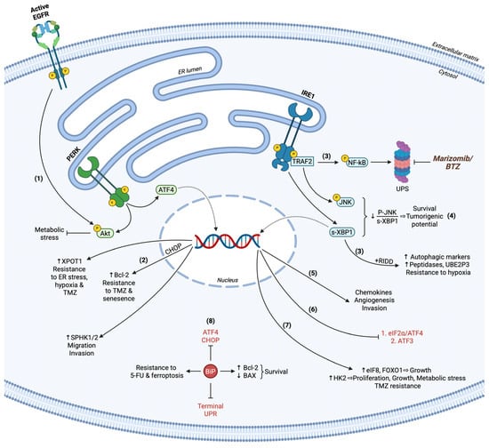 Pro-survival UPR in GBM. (1) PERK activation together with EGFR signaling regulates Akt phosphorylation status to relieve metabolic stress. (2) ATF4-related transcription induces XPOT1 and SPHK1/2 expression, providing pro-survival cues and facilitating migration and invasion, respectively. CHOP upregulates Bcl-2 and cooperates with ATF4, rendering GBM cells resistant to TMZ, ER stress, hypoxia, and senescence. (3) IRE1 synchronizes the transcription rates and secretion of chemokines for angiogenesis and invasion promotion. (4) Active IRE1 restricts terminal UPR by suppressing eIF2α/ATF4 and ATF3 pro-apoptotic functions. (5) Upon persistent XBP1 splicing and attenuated JNK activation through IRE1, GBM cells provoke proliferation and survival capacity. (6) All IRE1-induced mechanisms concerning RIDD, XBP1 modification, and NF-kB activation stimulate autophagy marker expression and autophagic flux, while NF-kB also orchestrates UPS-dependent protein recycling. UPS inhibitors BTZ and marizomib have been utilized in clinical trials for GBM therapy. (7) s-XBP1 gene targets eIF8, FOXO1, and HK2 enhance GBM growth, TMZ resistance, and survival upon hypoxic conditions. (8) BiP acts as a global inhibitor of terminal UPR and ATF4/CHOP effectors, maintaining low BAX/Bcl-2 ratio to hamper pro-apoptotic phenomena. BiP also demonstrates its cytoprotective role against acidic TME by compensating 5-FU chemotherapeutic effects and ferroptosis. Terminal UPR markers are indicated in red.