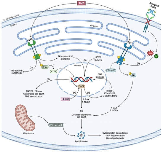 Roles of terminal UPR in GBM. (1) PERK inhibits pro-survival autophagy in a context-dependent manner. (2) PERK/eIF2α/ATF4 axis upregulates NOXA and Puma levels, coordinates autophagic cell death and substantiates TMZ-related apoptosis. (3) Non-canonical PERK signaling modulates SOX2 levels in response to TMZ treatment and results in stemness regulation and loss of viability. (4) CHOP overexpression correlates with the apoptotic phenotype of GBM cells upon ER stress, counteracted through 14-3-3β chaperone. (5) CHOP reduces DNA damage repair enzymes’ levels and activity (Rad51, MGMT, MPG, ATM/CHK2) and accelerates genome instability. (6) Loss of active EGFR signaling concludes to excessive ROS and Ca2+ accumulation and concomitant ER stress. IRE1 mediates cell death via JNK activation and simultaneous suppression of ERK/p38 signaling, in parallel with CHOP, to advance BAX and NOXA function. (7) Terminal UPR initiates caspase-dependent cell death.