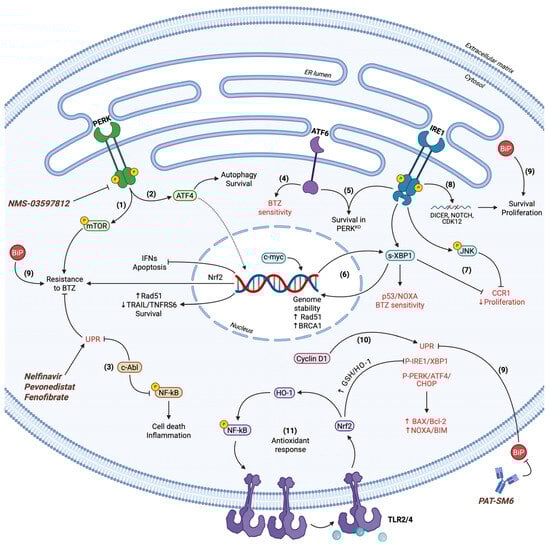 UPR in MM cell fate determination. (1) PERK regulates mTOR activity and provides resistance to BTZ. PERK inhibitors (NMS-03597812) and ER stress inducers (Nelfinavir, Pevonedistat, Fenofibrate) have been utilized in clinical trials for MM therapy. (2) ATF4 exhibits dual roles in MM survival by promoting pro-survival autophagy and the expression of key molecules, including Rad51 and Nrf-2 for genome stability and ROS neutralization, respectively. ATF4 inhibits IFNs and concomitant cell death, while simultaneously downregulates TRAIL and TNFRS6. (3) c-Abl suppresses both terminal UPR and NF-kB activity to further enhance BTZ resistance and resilience to cell death. (4) ATF6 expression correlates with BTZ sensitivity in a context-dependent manner in BTZ-susceptible MM cell lines. (5) IRE1 together with ATF6 demonstrate persistent activation to advance pro-survival cues in response to perturbed PERK signaling. (6) IRE1 and c-myc acting independently propagate s-XBP1 function to regulate gene expression in a context-dependent manner. Rad51 and BRCA1 induction safeguard cell viability, whereas s-XBP1 also regulates p53 and NOXA to substantiate apoptosis. (7) IRE1 synchronizes s-XBP1 and JNK activity to downregulate CCR1 expression and attenuate cell proliferation. (8) IRE1 via RIDD targets CDK12, DICER, and NOTCH mRNAs to promote proliferative and survival capacity. (9) BiP acts as a multifunctional cytoprotective regulator. It cooperates with UPR sensors for cell survival and tumorigenicity while simultaneously inhibiting all terminal UPR branches and downstream effectors. Hence, BAX/Bcl-2 and NOXA/Bim ratios are significantly downregulated. BiP overexpression is a marker for BTZ resistance of MM cells. Monoclonal immunoglobulin M antibody PAT-SM6 targeting extracellular BiP has been utilized in clinical trials for MM therapy. (10) Cyclin D1 provokes terminal UPR signaling in spite of its canonical roles in cell proliferation. (11) TLR2/4 signaling activates Nrf-2. Nrf-2 induces the expression of GSH and HO-1 antioxidant en-zymes. All the above independently contribute to terminal UPR inhibition and cell survival. HO-1 indirectly provokes NF-kB signaling, which in turn elevates TLR4 levels. This positive feedback loop performs independently, but in parallel with UPR signaling to abrogate the latter’s apoptotic func-tions. Terminal UPR markers are indicated in red.