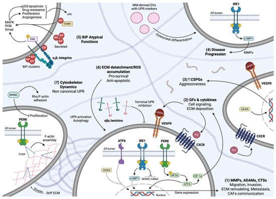 Communication between ECM and UPR. (1) All URP branches induce the expression of extracellular proteases to catalyze ECM remodeling and concomitant migration, invasion, metastasis, and interplay with surrounding CAFs. (2) Canonical UPR signaling and ATF4-dependent HIF-1 transactivation upregulate GF and cytokine expression and secretion to substantiate ECM deposition and cell signaling in an autocrine and paracrine fashion. (3) OASIS activity correlates with CSPG deposition and GBM aggressive phenotype. (4) MM-derived EVs containing UPR markers are encapsulated by osteoclasts, stimulating IRE1 activity, MMPs expression, and MM-related bone disease progression. (5) Cell-surface BiP cooperates with αxβ1 integrin/FAK axis and interacts with Cripto extracellular protein to trigger MAPK, PI3K/Akt, and Smad signaling, while secreted BiP regulates the survival/cell death equilibrium to favor BTZ resistance of MM cells and apoptosis inhibition. (6) Compromised ECM nature upon cell detachment resulting in ROS accumulation is counteracted through UPR activity, together with pro-survival autophagic flux. Laminins contribute to ECM fidelity and cell homeostasis by suppressing terminal UPR. (7) Stiff ECM is monitored as a stress-inducing condition and commands for PERK overexpression, allowing PERK/FLNA interaction and F-actin assembly to readjust cytoskeleton dynamics and adaptation of GBM cells in their TME. IRE1 cleaves and depletes SPARC mRNA, leading to excessive proliferation rate, altered Rho/F-actin architecture, and attenuated migration.