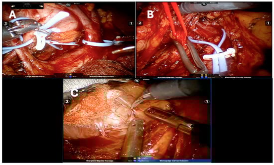 Surgical phases of robot-assisted partial nephrectomy: (A) pedicle isolation; (B) arterial clamping; (C) tumor excision.