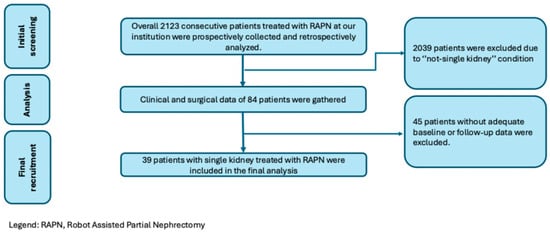 Overall, 2123 patients treated with RAPN were gathered; of those, 2084 did not meet the inclusion criteria and were excluded, while 39 patients who underwent RAPN for renal tumors in a solitary kidney were included (Figure 2).