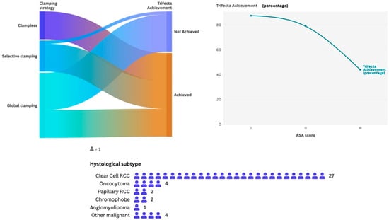 The achievement of Trifecta, defined by the absence of major complications (Clavien-Dindo > 2), negative surgical margins and a less than 30% decline in eGFR, was accomplished in 66.6% of cases. These results align with previously reported success rates of RAPN in solitary-kidney patients, further substantiating its role as a feasible nephron-sparing surgical option for such complex cases [24,25]. However, it is noteworthy that global clamping and ASA scores >2 emerged as independent predictors of Trifecta failure. Selective or zero-ischemia strategies, when feasible, may mitigate ischemic damage, improving functional outcomes without compromising oncological control [26]. In this light, recent technological innovations, which can be integrated into the robotic console, may assist the surgeon in the preoperative and intraoperative phases, leading to a more accurate tailoring of the surgical strategy [27,28,29].