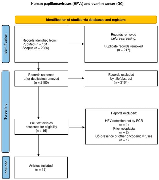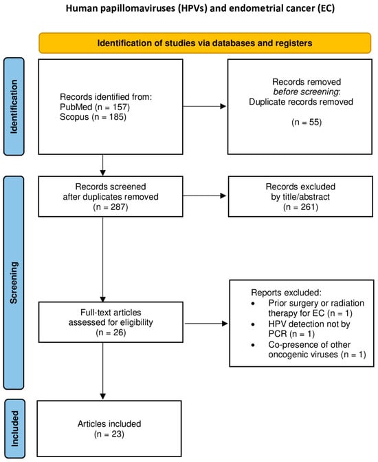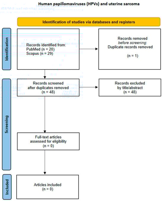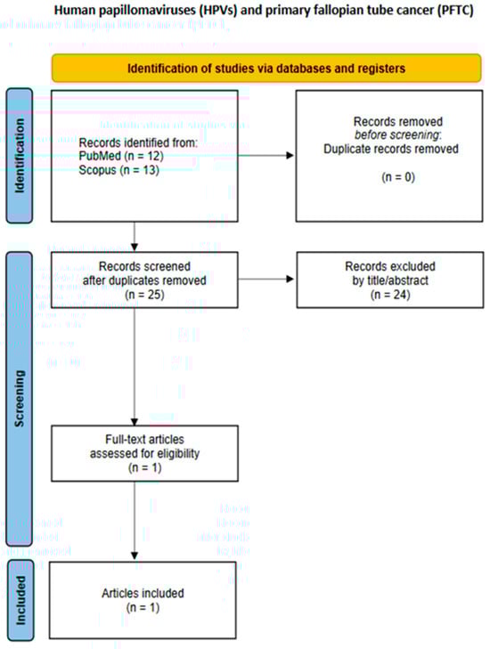 This is a comprehensive review of the literature that aims to summarize the current evidence regarding the prevalence of HPV DNA isolated from malignant tumors of the female upper reproductive tract, excluding the cervix uteri, i.e., epithelial and mesenchymal tumors of the corpus uteri, fallopian tube tumors, ovarian tumors, and primary peritoneal tumors [13]. The present review was conducted following the preferred reporting items for systematic reviews and meta-analysis (PRISMA) recommendations [14].