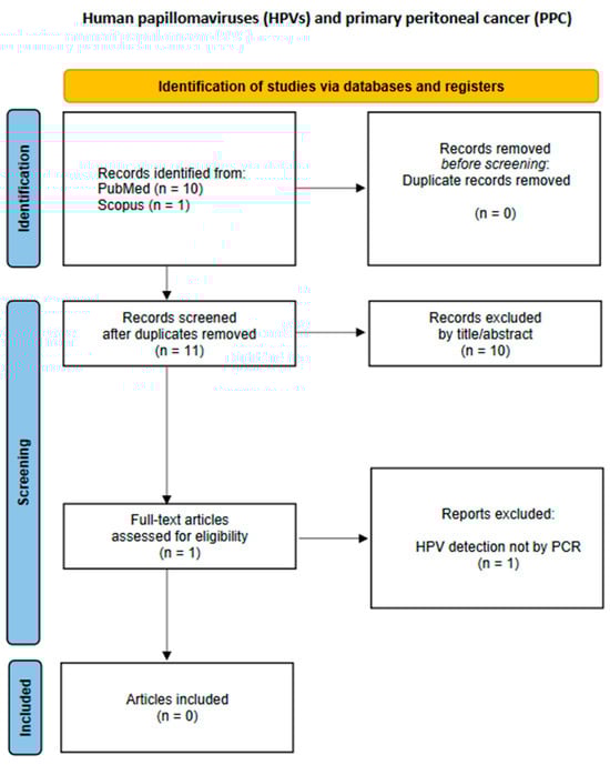 A study by Gatalica et al. published in 2008 described a case of low-grade peritoneal mucinous carcinomatosis containing high-risk HPV sequences (HPV-16, -18, -31, -33, -35, -39, -51, -52, -56, -58, and -66) [50]. However, it did not meet the eligibility criteria and thus had to be excluded, because the presence of HPV was not confirmed by PCR but by in situ hybridization, without exact HPV genotyping. Therefore, our search retrieved no relevant results.