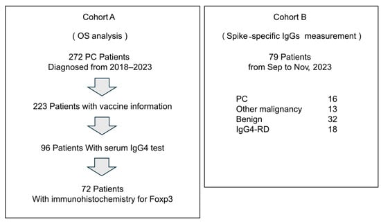 We performed a retrospective analysis at the Department of Gastroenterology, Miyagi Cancer Center, where 272 patients with PCs were enrolled between January 2018 and November 2023 (Cohort A, Figure 1). Among them, the vaccination history information at diagnosis was available for 223 patients, and the total IgG and IgG4 levels were determined (turbidimetric and latex turbidimetric immunoassays, respectively; BML, Tokyo, Japan) in 96 patients. Of these 96 patients, biopsies or surgical resections, as well as immunohistochemistry for Foxp3, were performed in 72 patients. The specimens from the 72 cases comprised 30 surgical specimens, 39 endoscopic ultrasound-guided fine-needle aspiration biopsy (EUS-FNA) specimens, and 3 biopsy specimens of the duodenal and bile duct invasion sites, all of which were primary PC.