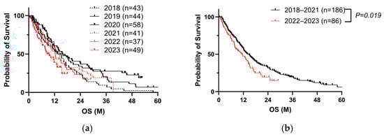 Repeated COVID-19 vaccination correlates with poor prognosis of PC. (a) Kaplan–Meier analysis from 2018 to 2023 in Cohort A by year. (b) Kaplan–Meier analysis of 272 PC patients in Cohort A (log-rank test, p = 0.019, median 11.2 months vs. median 14.1 months). (c) Kaplan–Meier analysis of 223 PC patients with known vaccination history in Cohort A (log-rank test, p = 0.006, median 10.3 months vs. median 14.9 months). (d) Kaplan–Meier analysis of 96 PC patients after propensity score matching for TNM factors, surgery, and chemotherapy in Cohort A (log-rank test, p = 0.038, median 11.2 months vs. median 14.2 months).