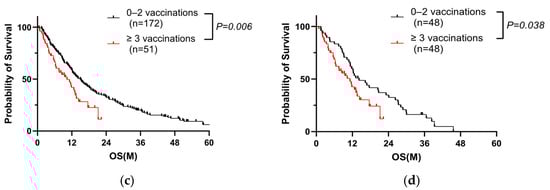 We analyzed the prognosis of PC patients before and after receiving SARS-CoV-2 vaccination from 2018 to 2023 (Table 1, Cohort A). Patient outcomes had improved each year by 2020; however, it began to deteriorate in 2021 (Figure 2a). The outcomes in 2022–2023 were significantly worse than those in 2018–2021 (Figure 2b). Cox proportional hazards analysis indicated that a history of receiving COVID-19 vaccinations (three or more times) at the initial visit, PS, jaundice, high TNM factors, no surgery, no chemotherapy, and high tumor markers including carcinoembryonic antigen (CEA) and carbohydrate antigen (CA) 19-9 significantly affected the overall survival (OS) (Table 2). Of 272 cases, the information of vaccination was recorded in 223 cases. When divided into two groups, 0–2 vaccinations, or more than three vaccinations, we found a poorer prognosis in the latter (Figure 2c). After propensity score matching for TNM factors, surgery, and chemotherapy, we obtained a similar result (Figure 2d, Table 3). These data suggest that repeated vaccinations are a negative prognostic factor.