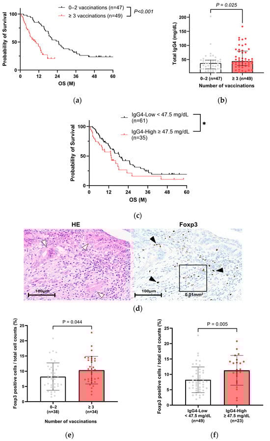 IgG4 is a negative prognostic factor in PC patients. (a) Kaplan–Meier analysis of 96 PC patients with known vaccination history and measured IgG4 levels in Cohort A (log-rank test, p < 0.001, median 10.3 months vs. median 20.8 months). (b) Comparison of total IgG4 levels by number of vaccinations in 96 PC patients of Cohort A (Mann–Whitney test, p = 0.025, ≥3 vaccinations vs. 0–2 vaccinations). (c) Kaplan–Meier analysis in PC patients with IgG4 test in Cohort A (* log-rank test, p = 0.076 and Gehan-Breslow-Wilcoxon test, p = 0.042, IgG4-high group vs. IgG4-low group, cutoff value for IgG4 is 47.5 mg/dL). (d) Representative images of PC tissues (white arrowheads: tumor cells) with Foxp3-positive lymphocytes (black arrows). A square frame (100 µm × 100 µm) was used to measure the number of Foxp3-positive cells/total cell counts. (e) Comparison of Foxp3-positive cells/total cell counts by number of vaccinations (Mann–Whitney test, p = 0.044, ≥3 vaccinations vs. 0–2 vaccinations). (f) Comparison of Foxp3 positive cells/total cell counts between high and low serum IgG4 groups (Mann–Whitney test, p = 0.005, cutoff value for IgG4 is 47.5 mg/dL). PC, pancreatic cancer.