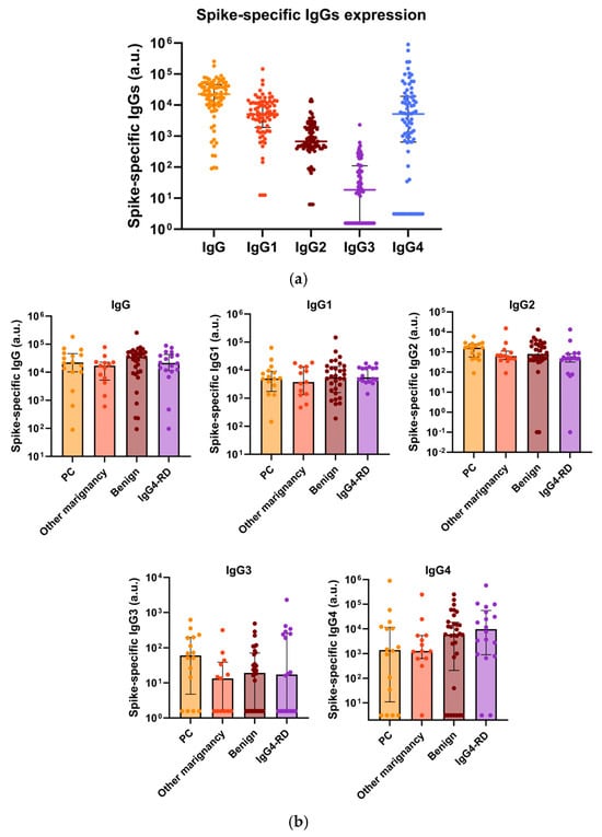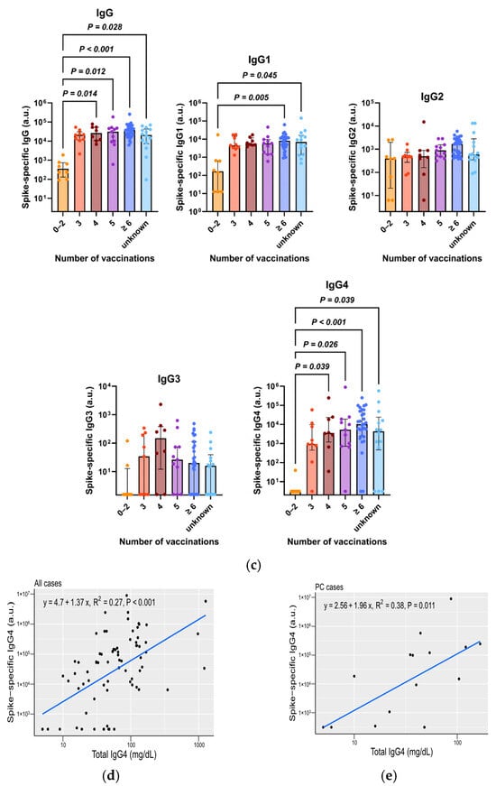 To confirm that the increase in the total IgG4 level was due to spike-specific IgG4, we determined the total and spike-specific IgGs in Cohort B. The characteristics of 79 patients in Cohort B are shown in Supplementary Table S4. We included malignant and benign diseases other than PC to determine whether the changes in IgGs depend on specific diseases. Spike-specific IgG1 and IgG4 were detected in higher amounts, whereas IgG2 and IgG3 were detected in lower amounts (Figure 4a). No significant difference was noted in the spike-specific IgG levels, including IgG4, between the disease types (Figure 4b). Spike-specific IgG4, IgG1, and IgG levels increased in the groups that were vaccinated more than three times (Figure 4c). Total IgG4 and spike-specific IgG4 levels were positively correlated in both cases (Figure 4d) and PC patients (Figure 4e). The spike-specific IgG4 high group tends to be a poorer prognosis than the spike-specific IgG4 low group in PC cases, although the difference is not significant due to the small samples (n = 16) (Supplementary Figure S5).