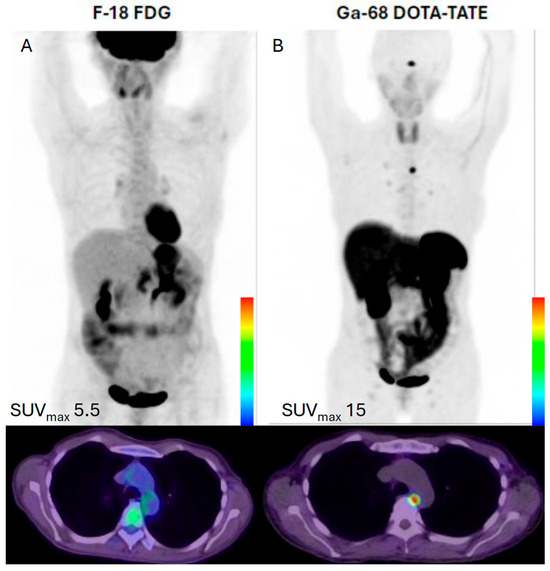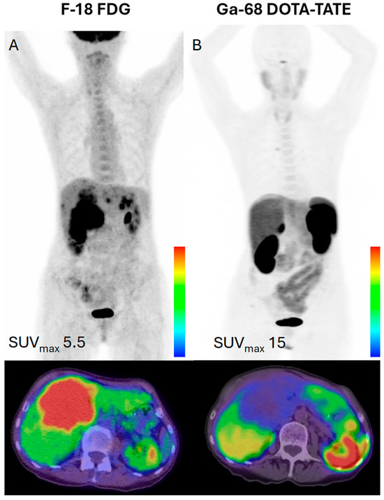 Somatostatin is a peptide hormone that binds to somatostatin receptors (SSTRs) to down-regulate tumoral growth, assisting in disease control. These SSTRs, particularly SSTR2 expressed in neuroendocrine tumors, can be visualized noninvasively by labeling artificially synthesized somatostatin analogs with positron emitters, such as F-18, Ga-68, and Cu-64. Historically, gamma-emitting radiopharmaceuticals have been used, but they have become less commonly used due to their poorer performance than their positron-emitting counterparts. Indium-111 octreotide was used as a gamma emitter prior to the development of effective PET agents, but has been essentially replaced due to its inferior image quality and resolution. SSTR PET/CT has shown superiority over indium-111 octreotide and conventional diagnostic imaging, especially for identifying nodal metastasis and subtle disease [10]. While SSTR agonists are more often used, interest in SSTR antagonists has grown due to their increased tumor-to-background ratio and pharmacokinetic advantages. The current guidelines recommend performing an SSTR PET/CT for staging, following a therapeutic response, and for prognostication with standardized reporting procedures [11,12,13,14]. An SSTR PET/CT is critical for assessing the potential benefit of PRRT, local–regional therapies, and systemic treatment options. In the phase II prospective Lumen study, a Ga-68 DOATATATE PET/CT was shown to be an effective prognostic indicator, and patients with an SUVmax lower than 13.0 had a poorer response to PRRT [15]. Additionally, Ga-68 DOTATOC has been shown to be superior to CT and MR imaging for the initial staging of neuroendocrine neoplasms for patients being evaluated for surgical intervention, changing the management of 59.6% of cases in a 52-patient cohort study by Frilling and colleagues [16]. Changes in management may occur for various reasons, most commonly in the setting of newly identified metastases or disease heterogeneity not appreciated on tissue sampling. Therefore, while the pathological grading is important, some studies have shown no difference in the overall survival between G1 and G2, prompting Strosberg and colleagues to recommend a higher mitotic cutoff of five per high-power field rather than the current three per high-power field [17,18]. Additionally, sampling tissues from one to two sites of the disease or the surgical resection of the primary may not capture disease heterogeneity in patients with numerous lesions as effectively as a whole-body SSTR and FDG PET/CT.