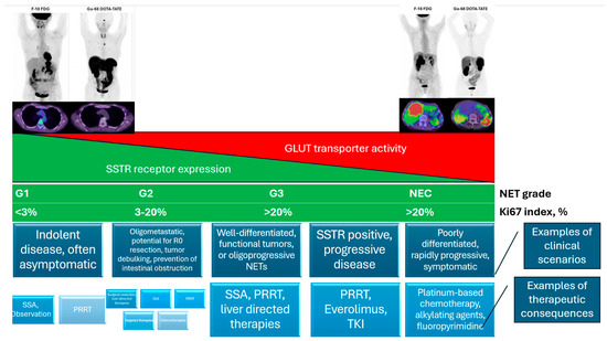 - Chan, D.L.; Pavlakis, N.; Schembri, G.P.; Bernard, E.J.; Hsiao, E.; Hayes, A.; Barnes, T.; Diakos, C.; Khasraw, M.; Samra, J.; et al. Dual Somatostatin Receptor/FDG PET/CT Imaging in Metastatic Neuroendocrine Tumours: Proposal for a Novel Grading Scheme with Prognostic Significance. Theranostics 2017, 7, 1149–1158. [Google Scholar] [CrossRef] [PubMed]