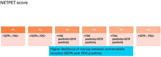 Summary of the NETPET scoring system, which highlights the variable radiotracer uptake based on the radiomic features of NENs. P0 represents a lesion with no SSTR or FDG radiotracer positivity. P1 lesions demonstrate an SSTR-targeted radiotracer positivity without significant FDG radiotracer positivity. P2–P4 lesions express variable SSTR positivity. P5 represents a poorly differentiated neuroendocrine tumor that no longer expresses detectable somatostatin receptors.