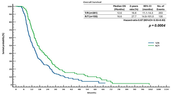 Patients receiving sequential therapy T/R (n = 261) compared to the reverse sequence (R/T, n = 155) were evaluated for OS and PFS, assessed by applying Kaplan–Meier analyses. With a median time period of 16.6 months (95% CI: 14.8–101.0), as opposed to 12.6 months (95% CI: 11.1–14.3) in the T/R group, the R/T sequence showed a statistically significant improvement in OS (HR = 0.67; 95% CI: 0.53–0.83; p = 0.0004). The R/T and T/R groups had estimated 2-year OS rates of 27.7% and 16.8%, respectively (Figure 2).