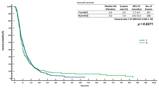With 361 and 286 events recorded, respectively, the median OS for the T and R groups was 5.9 months (95% CI: 3.5–7.7) and 5.0 months (95% CI: 9.0–13.4). The R group produced a somewhat greater 2-year OS rate (7.9%) than the T group (3.5%). However, there was no statistically significant difference in the survival outcomes between the two monotherapies, as indicated by the calculated hazard ratio (HR) for OS, which was 1.01 (95% CI: 0.86–1.19; p = 0.8371) (Figure 4).