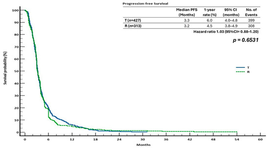 Similarly, with 399 and 308 events recorded, respectively, the median PFS for T and R was 3.3 months (95% CI: 4.0–4.8) and 3.2 months (95% CI: 3.8–4.9), respectively. The T group’s 1-year PFS rate was 6.0%, while that of the R group was 4.5%. There was once more no discernible difference between the two therapies, as evidenced by the HR for a PFS rate of 1.03 (95% CI: 0.88–1.20; p = 0.6531) (Figure 5).