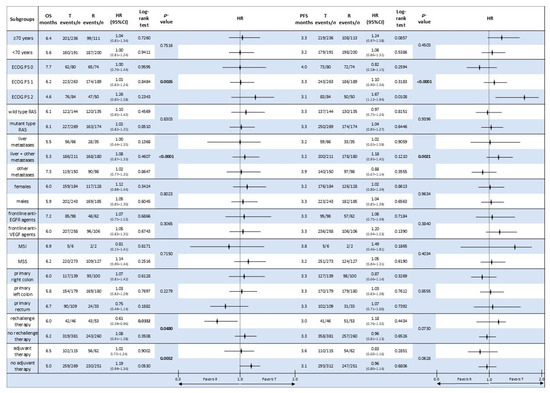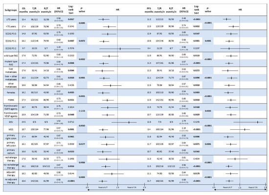 Except for certain subgroups indicated below, no statistically significant difference in OS or PFS was found between T and R across all examined subgroups, including age, ECOG performance status, RAS status, metastatic sites, sex, prior biologic therapy, MMR status, primary tumour location, use of rechallenge therapy, and adjuvant therapy.