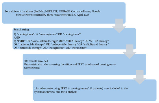 Muoio B, Iacovitti CM, Bosetti DG, Sansovini M, Cuzzocrea M, Paone G, Treglia G. Peptide Receptor Radionuclide Therapy in Patients with Advanced, Recurrent or Progressive Meningioma: An Updated Systematic Review and Meta-Analysis. Cancers. 2025; 17(12):2039. https://doi.org/10.3390/cancers17122039