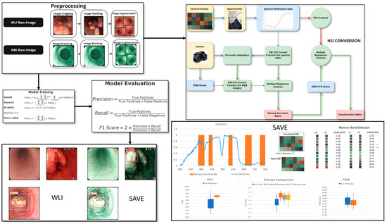 Hyperspectral imaging (HSI), or imaging spectroscopy, captures spatial and spectral data across hundreds of contiguous wavelengths, generating a three-dimensional “hypercube” that maps tissue composition and physiological properties for each pixel [14]. Unlike conventional imaging modalities, HSI provides a dense spectral signature for every spatial point, enabling the detection of subtle mucosal and submucosal abnormalities that are invisible under standard white-light imaging (WLI) [15,16,17,18]. Commercially available HSI systems operate across ultraviolet (200–380 nm), visible (380–780 nm), and near-infrared (780–2500 nm) spectra, offering unparalleled resolution for distinguishing pathological features [19,20]. Narrow-band imaging (NBI), a specialized form of HSI, enhances the vascular and mucosal contrast by selectively illuminating tissues with 415 nm (blue) and 540 nm (green) wavelengths [21]. Blue light penetrates deeper submucosal layers to highlight the subsurface vasculature, while green light reflects superficial capillaries, improving the visualization of early neoplastic changes [22]. For instance, Zhang et al. demonstrated that magnifying endoscopy with NBI (ME-NBI) significantly outperformed WLI in diagnosing early gastric cancer, achieving sensitivity and specificity values of 0.83 and 0.96 compared to 0.48 and 0.67 for WLI [23]. Despite its diagnostic potential, NBI remains underutilized due to hardware limitations in regard to many endoscopy systems. To address this gap, our study integrates HSI with a novel spectral band selection algorithm, the Spectrum-Aided Vision Enhancer (SAVE), to transform conventional WLI endoscopic images into high-fidelity spectral representations. By coupling the SAVE with advanced deep learning architectures (YOLOv9, YOLOv10, YOLO-NAS, RT-DETR, and Roboflow 3.0), we aim to improve the detection of EC stages and anatomical locations. This approach leverages hyperspectral data to train models for identifying dysplasia and squamous cell carcinoma (SCC), overcoming the spectral sparsity of traditional WLI.
