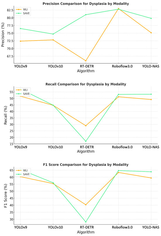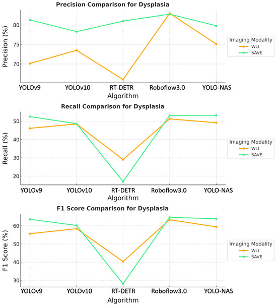 Comparative analysis of precision, recall, and F1 score for the detection of dysplasia using different object detection algorithms (YOLOv9, YOLOv10, RT-DETR, Roboflow 3.0, and YOLO-NAS) across two imaging modalities, namely WLI and SAVE during the testing.
