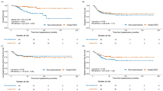 Descriptive statistics were used to analyze the patient characteristics and treatments. These characteristics were compared between non-endometrioid and grade endometrioid carcinoma using Fisher’s exact test and the Mann–Whitney U test. Survival analyses were performed using the Kaplan–Meier method, and the resulting data were evaluated using the log-rank test. The date of origin of all the survival outcomes was defined as the hysterectomy date. The follow-up duration for each patient was defined as the time from the date of hysterectomy to the date of death, censoring, or last follow-up. The median follow-up was calculated using the reverse Kaplan–Meier method. Overall survival (OS) and disease-free survival (DFS) were evaluated from the date of hysterectomy to the date of death or disease recurrence, respectively, or to the date of the last follow-up, if no event occurred. Locoregional recurrence-free survival (LRRFS) was defined as the time from hysterectomy to pelvic or vaginal recurrence. Distant metastasis-free survival (DMFS) was defined as the time from hysterectomy to the occurrence of evidence of distant metastasis.