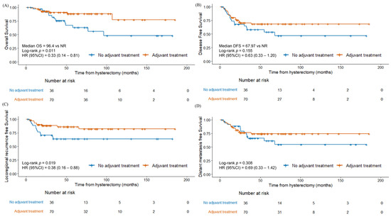 The risk evaluation was divided into four groups based on the unfavorable prognostic factors for OS, as identified through univariate analysis, including the absence of PLND, non-endometrioid endometrial cancer, and a higher DOI. Group 1 included patients with all the favorable factors (grade 3 endometrioid carcinoma, DOI < 25%, with PLND). Group 2 had one unfavorable factor (one of non-endometrioid endometrial cancer, a DOI ≥ 25%, or without PLND). Group 3 had two unfavorable factors (two of non-endometrioid endometrial cancer, a DOI ≥ 25%, or without PLND). Group 4 included patients with all the unfavorable factors (non-endometrioid endometrial cancer, a DOI ≥ 25%, without PLND). Subgroup analysis was conducted according to the risk groups. The 3-year OS, DFS, LRRFS, and DMFS rates for patients without any unfavorable factors (group 1) were 100%, 69.2%, 83.3%, and 69.2%, respectively (Figure S1). A difference was observed in the OS between the risk groups (p = 0.135) without statistical significance. When the patients in groups 2 and 3 were combined, adjuvant treatment was associated with better survival outcomes, including OS (p = 0.009), DFS (p = 0.021), and LRRFS (p = 0.034) (Figure S2). In contrast, the other group exhibited no significant differences.