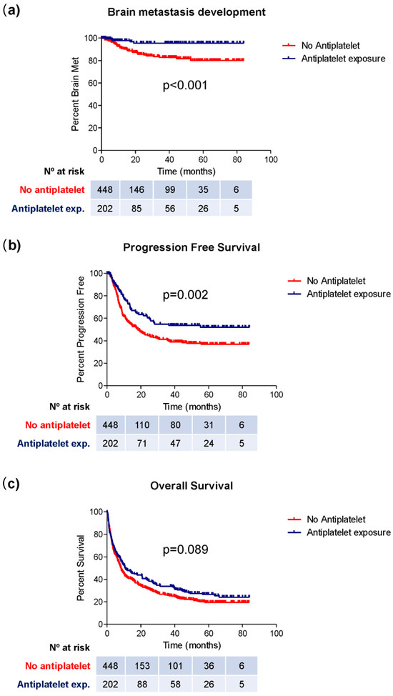 Kaplan–Meier curves representing the median period of brain metastasis development (a), PFS (b), and OS (c) in groups of patients exposed or not exposed to antiplatelet therapy.