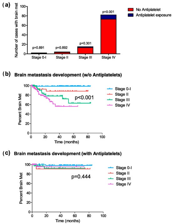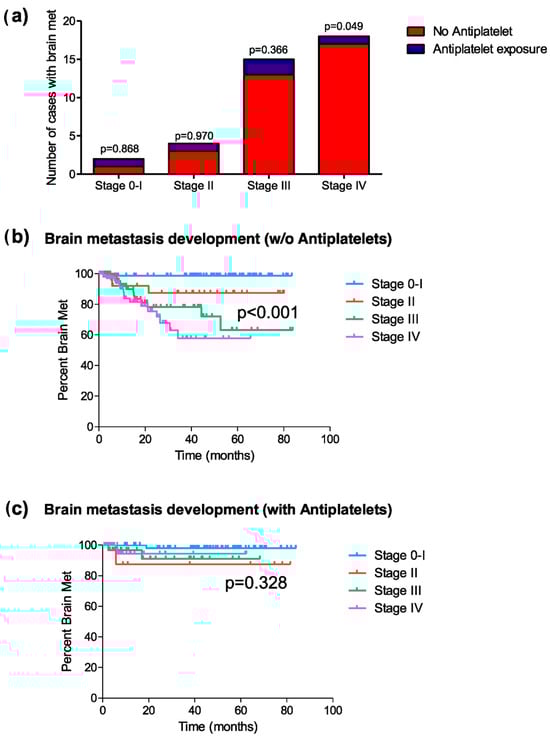 Brain metastasis development at any time during the disease. (a) Distribution of cases of brain metastasis in patients exposed or not exposed to antiplatelet therapy, classified by tumor stage; (b) Kaplan–Meier curves representing the median period of brain metastasis development at each tumor stage in patients not exposed to antiplatelet therapy; and (c) those exposed to antiplatelet therapy during the disease.