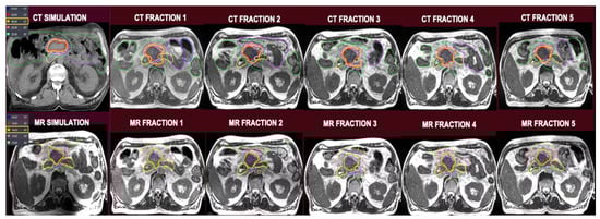 - Parikh, P.J.; Lee, P.; Low, D.A.; Kim, J.; Mittauer, K.E.; Bassetti, M.F.; Glide-Hurst, C.K.; Raldow, A.C.; Yang, Y.; Portelance, L. A multi-institutional phase 2 trial of ablative 5-fraction stereotactic magnetic resonance-guided on-table adaptive radiation therapy for borderline resectable and locally advanced pancreatic cancer. Int. J. Radiat. Oncol. Biol. Phys. 2023, 117, 799–808. [Google Scholar] [CrossRef] [PubMed]