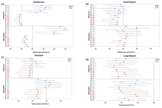 Forest plots of individual GI OARs displaying median dose levels with 95% confidence intervals for relevant dosimetric constraints achieved with initial simulation plans (InP) and treatment fraction plans (Fx1-5) using CTgRT (CT) vs. SMART (MR): (a) Duodenum V35 Gy and V40 Gy, (b) Small Bowel V35 and V40 Gy, (c) Stomach V35 Gy and V40 Gy, and (d) Large Bowel V38 Gy and V43 Gy. The horizonal dashed line represents the dose constraint for each respective GI OAR.